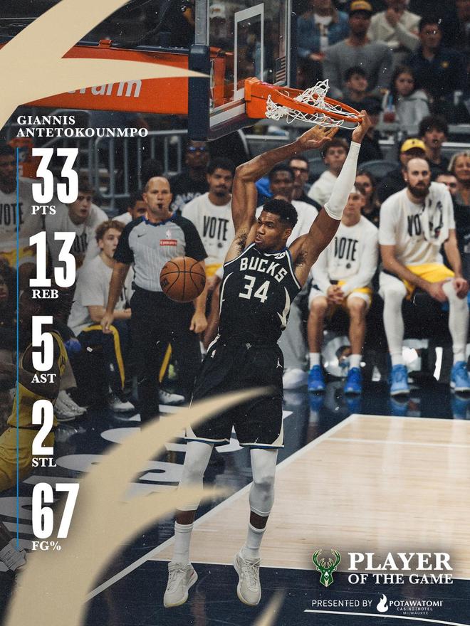 字母哥33+13献压哨绝杀,创历史第1神迹,雄鹿掀翻步行者!特纳9分5盖帽,西亚卡姆32+8!