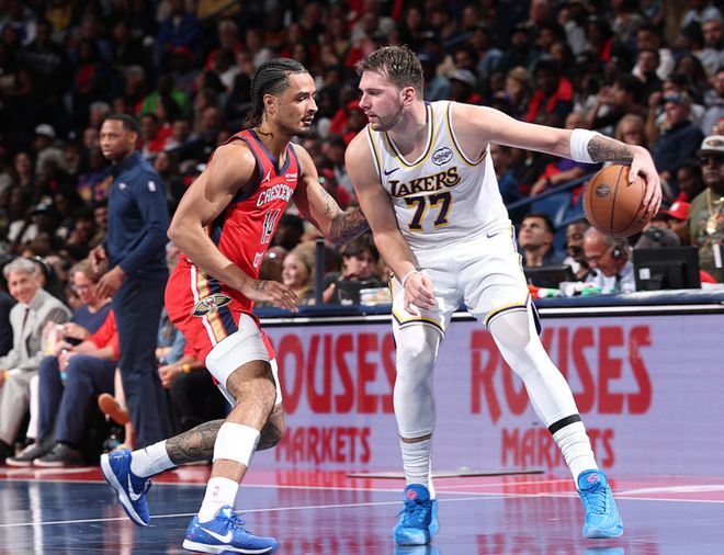 湖人客场对阵鹈鹕,湖人缺少了詹姆斯、文森特,鹈鹕缺少了锡安、穆雷、普尔,湖人优势明显,一直压制鹈鹕,一度领先22分,第四节鹈鹕一度把分差追到8分,随后里夫斯连续得分扩大了分差,最终湖人以14分优势拿下比赛。里夫斯16中9得到31分4板7助,东契奇16中6得到24分7板12助2断,艾顿11中10得到20分16板2助2断,鹈鹕方面墨菲21中13得到35分6板,费尔斯16中8得到19分4板3助8断。