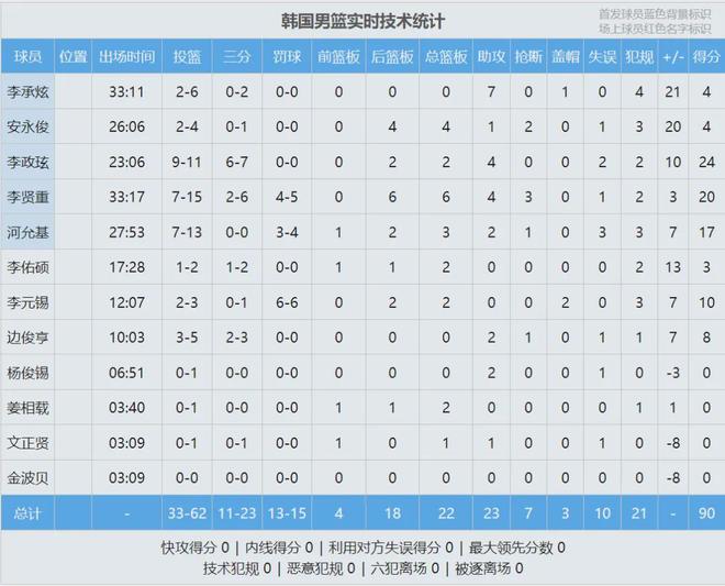 上半场打完,中国男篮29-52落后23分。中国男篮失误8比3,助攻5比11。李政玹上半场6投6中,其中三分球4中4,砍下16分2篮板2助攻。他出生于1999年4月14日,身高1米87,本赛季在韩国联赛场均17.6分,三分命中率38%。